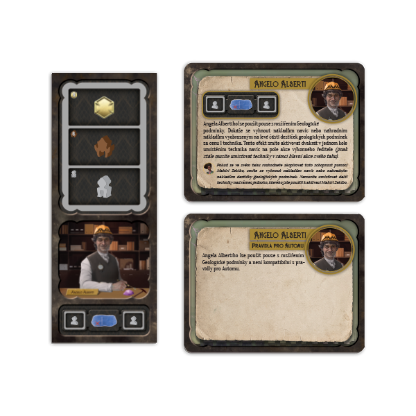 Angelo Alberti – Lze použít pouze s rozšířením Geologické podmínky. Dokáže se vyhnout nákladům navíc nebo náhradním nákladům vyobrazeným na levé části destiček geologických podmínek za cenu 1 technika. Tento efekt smíte aktivovat dvakrát v jednom kole umístěním technika navíc na pole akce výkonného ředitele.